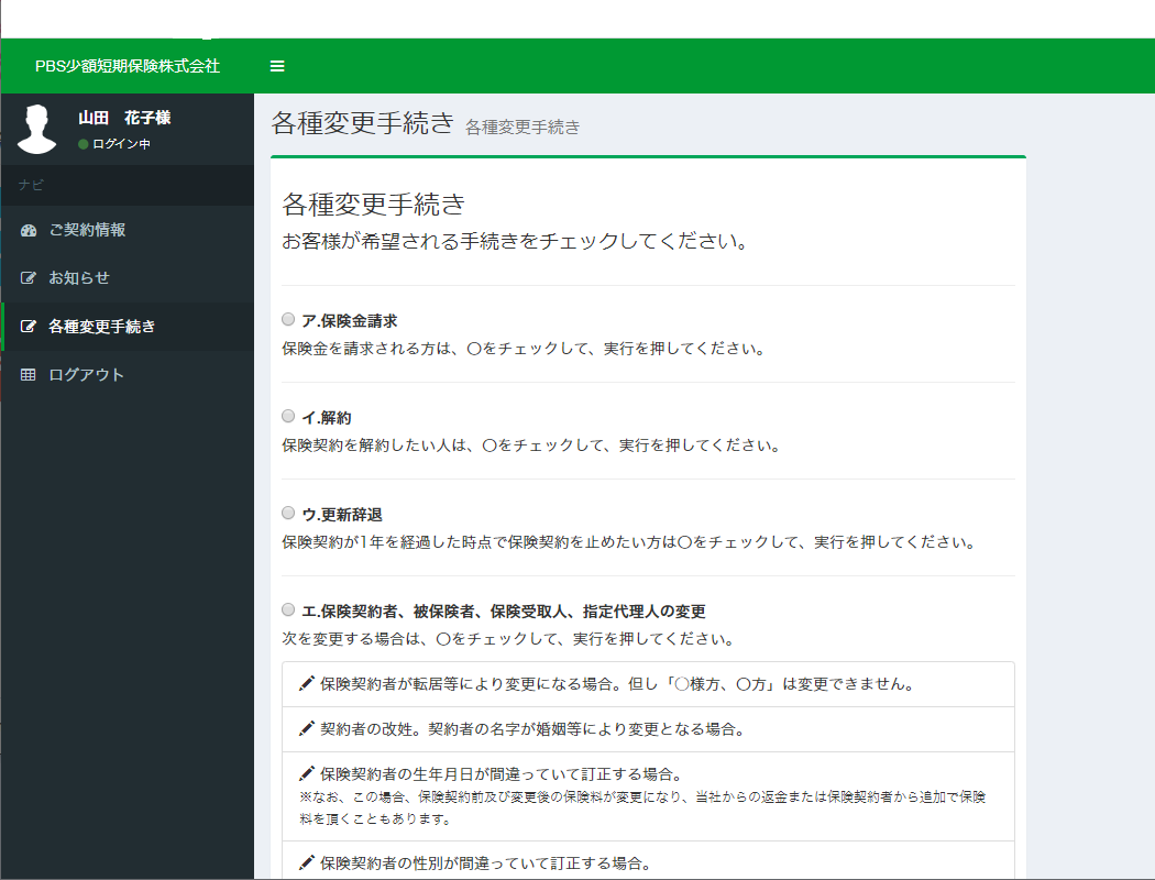 保険申込みの受付から契約者本人が申込状況、内容、契約状況及び契約内容の変更までおこなえる専用ページを提供可能です。